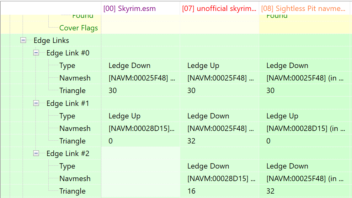 DayDreamer Posted 8 hours ago Author Posted 8 hours ago (edited) Very frustrating. Quote *** Not Found Triangle 0 in [NAVM:00028D15] (in GRUP Cell Temporary Children of SightlessPit01 "Sightless Pit" [CELL:00035299]) *** Not Found Triangle 2 in [NAVM:00028D15] (in GRUP Cell Temporary Children of SightlessPit01 "Sightless Pit" [CELL:00035299]) *** Not Found Triangle 6 in [NAVM:00028D15] (in GRUP Cell Temporary Children of SightlessPit01 "Sightless Pit" [CELL:00035299]) *** Not Found Triangle 11 in [NAVM:00028D15] (in GRUP Cell Temporary Children of SightlessPit01 "Sightless Pit" [CELL:00035299]) *** Not Found Triangle 12 in [NAVM:00028D15] (in GRUP Cell Temporary Children of SightlessPit01 "Sightless Pit" [CELL:00035299]) *** Island Triangle 13 in [NAVM:00028D15] (in GRUP Cell Temporary Children of SightlessPit01 "Sightless Pit" [CELL:00035299]) *** Not Found Triangle 14 in [NAVM:00028D15] (in GRUP Cell Temporary Children of SightlessPit01 "Sightless Pit" [CELL:00035299]) *** Not Found Triangle 15 in [NAVM:00028D15] (in GRUP Cell Temporary Children of SightlessPit01 "Sightless Pit" [CELL:00035299]) *** Not Found Triangle 16 in [NAVM:00028D15] (in GRUP Cell Temporary Children of SightlessPit01 "Sightless Pit" [CELL:00035299]) That USSEP added triangle 13 is the key. It is sideways, shares all 3 vertices with the rest of the navmesh, but has no connected sides. Probably a CK mistake, as it shouldn't be possible navmeshing by hand. Another problem is revealed by the "Skyrim - Clean edge links in navmeshes" script. A pair of edge links was lost: Quote Want match for triangle 5 in [NAVM:00025F5C] (in GRUP Cell Temporary Children of SightlessPit01 "Sightless Pit" [CELL:00035299]) via old Edge 0-1 link 0 ^^^ Check triangle 0 in [NAVM:00028D15] (in GRUP Cell Temporary Children of SightlessPit01 "Sightless Pit" [CELL:00035299]) Want match for triangle 0 in [NAVM:00028D15] (in GRUP Cell Temporary Children of SightlessPit01 "Sightless Pit" [CELL:00035299]) via old Edge 1-2 link 1 ^^^ Check triangle 5 in [NAVM:00025F5C] (in GRUP Cell Temporary Children of SightlessPit01 "Sightless Pit" [CELL:00035299]) Finally, xEdit reveals some USSEP changed edge links are going the wrong way; up and down have been reversed: So I've started over again (as can be seen by the screenshots) with minimally added triangles. Now it works. Still to do, the other "not found" triangles. USSEP adds a lot of triangles that aren't properly connected. A vanilla island [NAVM:000F43EF] may be the problem. Re-loading and re-checking the USSEP changes is very slow and tedious. Edited 8 hours ago by DayDreamer